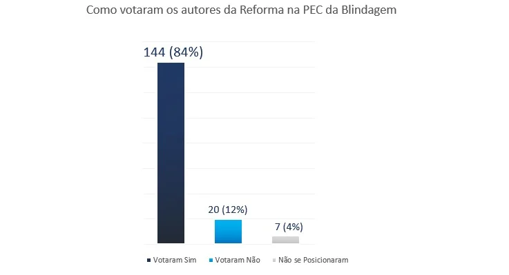 Segundo levantamento, dos 171 autores da PEC 38/2025, 144 votaram a favor da PEC da Blindagem, 20 foram contrários e 7 não participaram da votação no primeiro turno da Câmara.