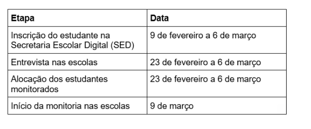 A inscrição no programa Aluno Monitor do BEEM deve ser feita no site da Secretaria Escolar Digital (SED).