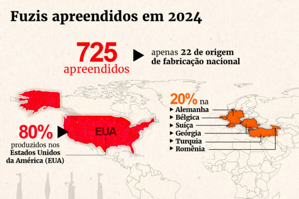 Segundo a Cfae, 725 fuzis foram apreendidos no RJ em 2024. Desses, apenas 22 foram fabricados no Brasil. Conforme apontado pelo coordenador, 80% das armas estrangeiras eram oriundas dos Estados Unidos, enquanto os outros 20% vieram de países como Alemanha, Bélgica, Suíça, Geórgia, Turquia e Romênia.