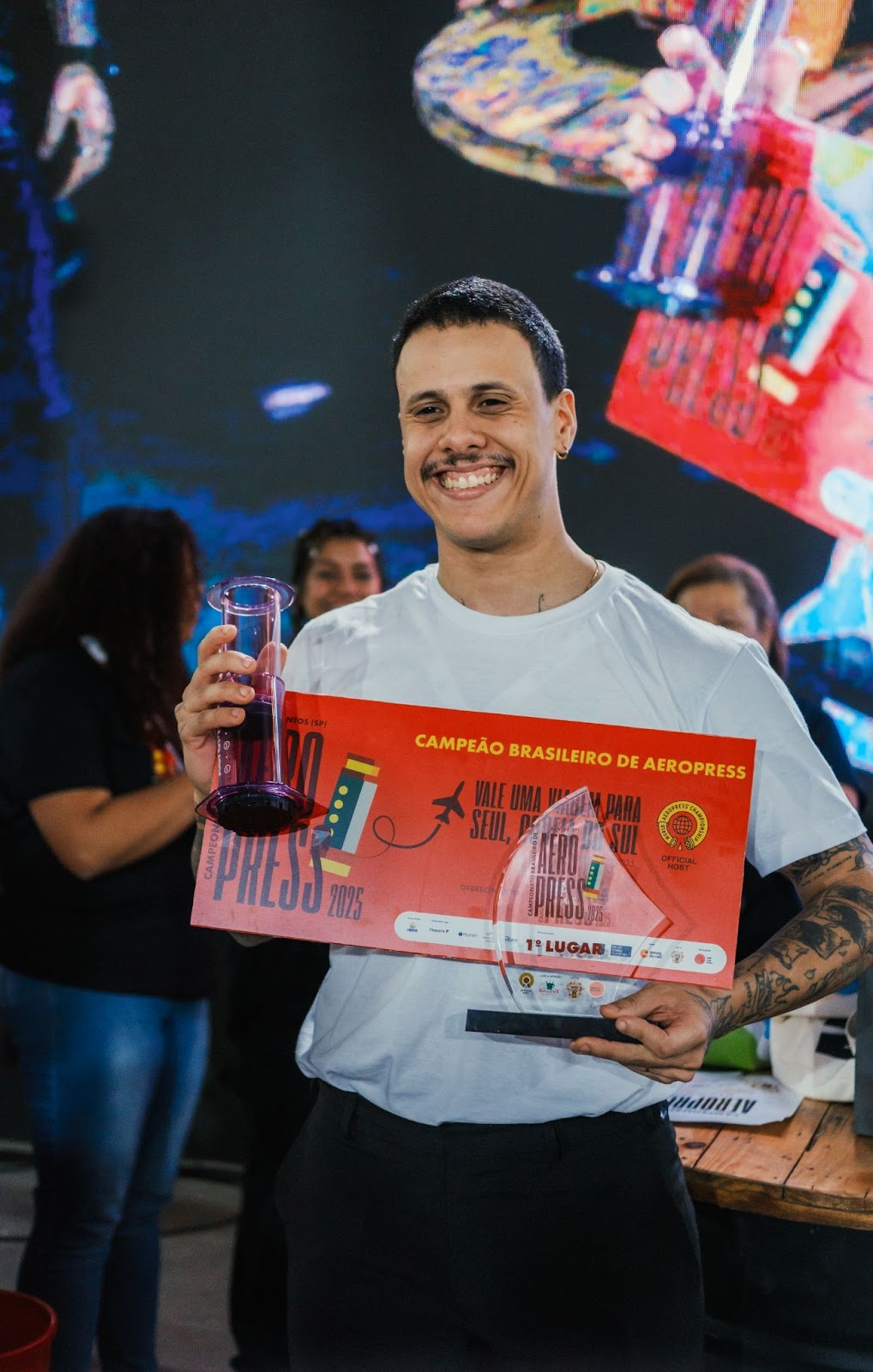 | lO Campeonato Brasileiro de Aeropress 2025 foi realizado nos dias 12 e 13 de julho durante o 10º Festival Santos Café, no Centro Histórico de Santos (SP). O barista Caio Paiva Lucena superou outros 44 competidores com a melhor receita de café no método Aeropress. A cidade de Santos (SP) recebeu – pela primeira vez – durante a décima edição do Festival Santos Café o Campeonato Brasileiro de Aeropress, que é a celebração do método de preparo de café que foi criado por Alan Adler, um engenheiro norte-americano, famoso por ter inventado também o brinquedo “Anel Voador, Aerobie”. O evento foi simultâneo a todas as atividades do Festival Santos Café e trouxe competidores de todo o Brasil. O campeonato nacional foi nos dias 12 e 13 de julho, na Frontaria Azulejada, em Santos (SP), com entrada gratuita, e movimentou milhares de visitantes. A disputa foi emocionante pois, a cada etapa, apenas um competidor passava à próxima fase. Após muitos chaveamentos de três competidores cada e mais de 20 rodadas de preparos de café com um total de 45 competidores passaram para as semifinais seis competidores: Matheus Filagrana (Blumenau-SC), Mayonn Del Sant (Curitiba-PR), Matheus Evangelista (Santos-SP), Caio Paiva Lucena (Santos-SP), Elis Bambil (São Paulo-SP) e Marcelo Silva (Brasília-DF). Na rodada final: o grande vencedor foi Caio Paiva Lucena, da Revo Manufactory, de Santos (SP). O pódio foi formado por Elis Bambil, da torrefação Massemba, de São Paulo (SP), em segundo lugar, e, em terceiro lugar, Marcelo Silva, da Ernesto Cafés Especiais, em Brasília (DF). O Campeonato Brasileiro de Aeropress 2025 foi uma realização da equipe da especialista em cafés e jornalista Mariana Proença – que há 19 anos atua no mercado de café em curadorias, eventos e competições que promovem os profissionais do setor. Café Anfitrião: Rei do Café; Água Oficial: Lindoya Verão; Patrocínio Ouro: Flavors; Patrocinadores: Bunn, Fazenda Eldorado, Grupo Utam, Gustavo Leonel Cafés Especiais, Mare Terra Coffee, Nude, Prima Qualità Cooxupé e Revo. Apoio: Museu do Café e Lab Carvalhaes. Divulgação: Café Logo Existo. Realização: Mariana Proença Comunicação&Eventos. Local: Festival Santos Café. Juízes convidados: Adriana Valinhas (Coffee School), Andrea Menocci (Cafeística), Bruno Medga (Campeão Cup Tasters), Eystein Veflingstad (OOP Café), Fernanda Marqueria (Museu do Café), Guilherme Mauri (Rei do Café), Hugo Rocco (Moka Clube), José Augusto Naves (Naves Coffee Co.), Luiz Eduardo Melo (Supernova Coffees), Nay Caldas (Joana Cafés), Roberto Polillo (Sabino Torrefação) e Timur Dudkin (Mare Terra Coffee) Pódio: 1º lugar – Caio Lucena (centro), 2º lugar – Elis Bambil (à esq.) e 3º lugar Marcelo Silva (à dir.) (Foto:@thefarcreative e @lucasmzz/Divulgação Campeonato Aeropress) A AeroPress foi lançada em 2005, depois de vários protótipos e, rapidamente, se tornou um método popular e versátil para preparar café. Ele buscava uma forma de extrair um café mais intenso e com textura de um coado, mas de forma mais eficiente e prática para levar para qualquer lugar. E, assim, desenvolveu a aeropress, que utiliza pressão de ar para extrair o café, resultando numa bebida mais encorpada e saborosa. Juiz principal, o norueguês Eystein Veflingstad, levanta a xícara escolhida pelos juízes em prova às cegas. (Foto:@thefarcreative e @lucasmzz/Divulgação Campeonato Aeropress) O formato do campeonato de aeropress pelo mundo ocorre da seguinte forma: a cada rodada, três concorrentes têm cinco minutos para preparar, extrair e servir cafés usando o método aeropress. Um grupo de juízes então toma às cegas todos os cafés, antes de apontar para a sua bebida favorita da rodada. O campeonato é bem descontraído, a melhor receita vai passando de fase até chegar no campeão, que ganha o direito de representar o Brasil no mundial. A competição começou a ser realizada no Brasil em 2015. Para Mariana Proença, organizadora do Campeonato Brasileiro de Aeropress: “é uma alegria imensa poder promover esse evento simultâneo ao Festival Santos Café pela primeira vez em Santos, com milhares de visitantes ao longo dos dois dias. Todos que foram até a competição interagiram e puderam conhecer mais sobre o aeropress, o que amplia a nossa cultura sobre a bebida café e suas possibilidades. A vitória do Caio Lucena veio repleta de entusiasmo porque também homenageia a cidade. São dez anos deste Festival que divulga a cultura e a história do café em Santos. Agora o campeão brasileiro irá continuar essa jornada levando suas habilidade para o mundial na Coreia do Sul. Estamos na torcida!” Barista Caio Lucena e a organizadora Mariana Proença – a competição mundial será em dezembro. (Fotos: @thefarcreative e @lucasmzz/Divulgação Campeonato Aeropress) Pôster Oficial da Competição de 2025 Arte de Juliana Bernardo A proposta visual desta peça parte da releitura gráfica do Aeropress, integrada com a paisagem urbana característica da cidade de Santos, marcada por seus prédios inclinados presentes na orla da praia. A composição utiliza elementos geométricos e paleta retrô para remeter tanto à estética do design modernista quanto à identidade visual dos festivais de café. As formas “tortas’’ e sobrepostas buscam representar a irregularidade charmosa das construções santistas, enquanto celebram a diversidade e o movimento constante do universo do café. Equipe organizadora do Campeonato Brasileiro de Aeropress 2025, juízes e competidores com o Secretário de Turismo, Comércio e Empreendedorismo da Prefeitura de Santos: Thiago Papa. O que éO Campeonato Brasileiro de Aeropress é considerado o mais descontraído do mundo do café. Ele foi criado para agregar todos que queiram competir. Basta se inscrever, levar seu método aeropress e se divertir! (Foto:@thefarcreative e @lucasmzz/Divulgação Campeonato Aeropress) Cada competidor c