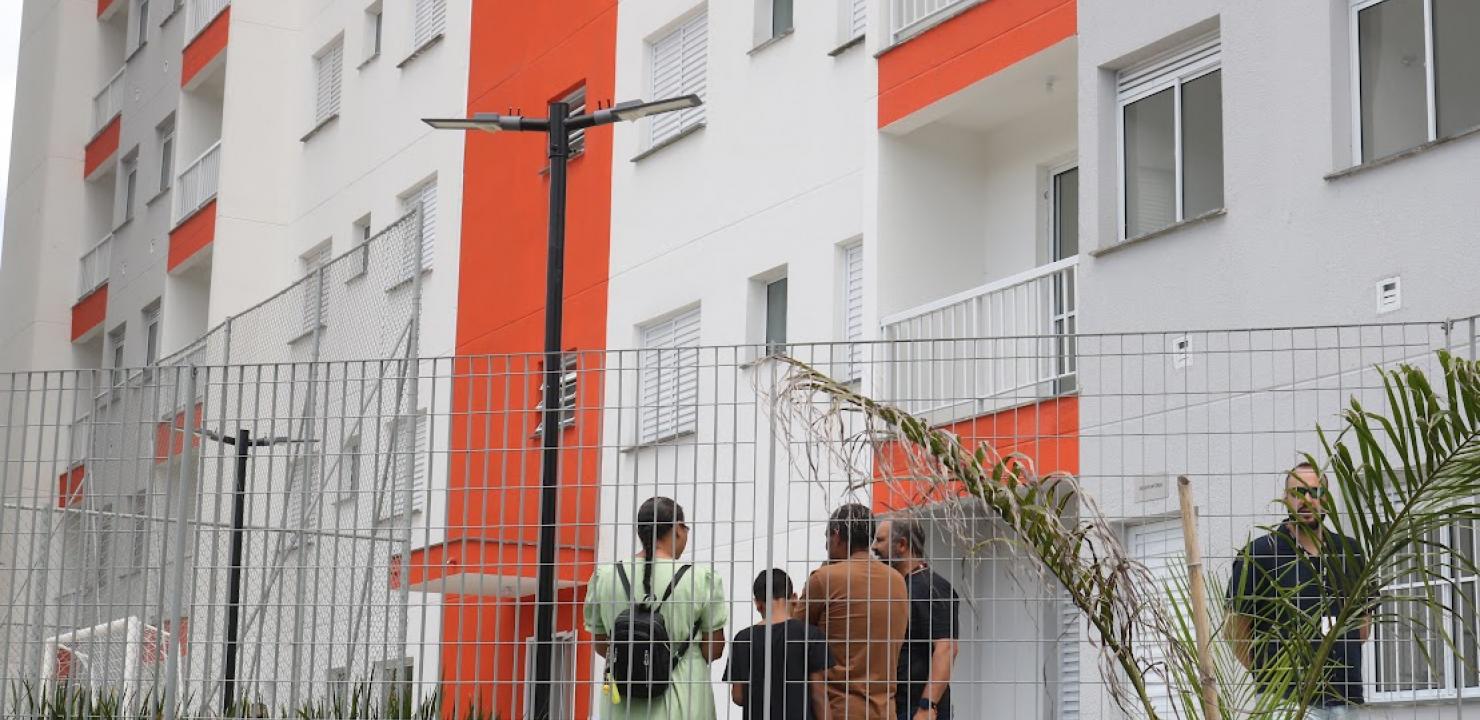 O empreendimento, construído pela CDHU, está em área cercada por muito verde e conta com 174 apartamentos, distribuídos em duas torres, com varanda, elevadores, área de lazer e espaço pet.