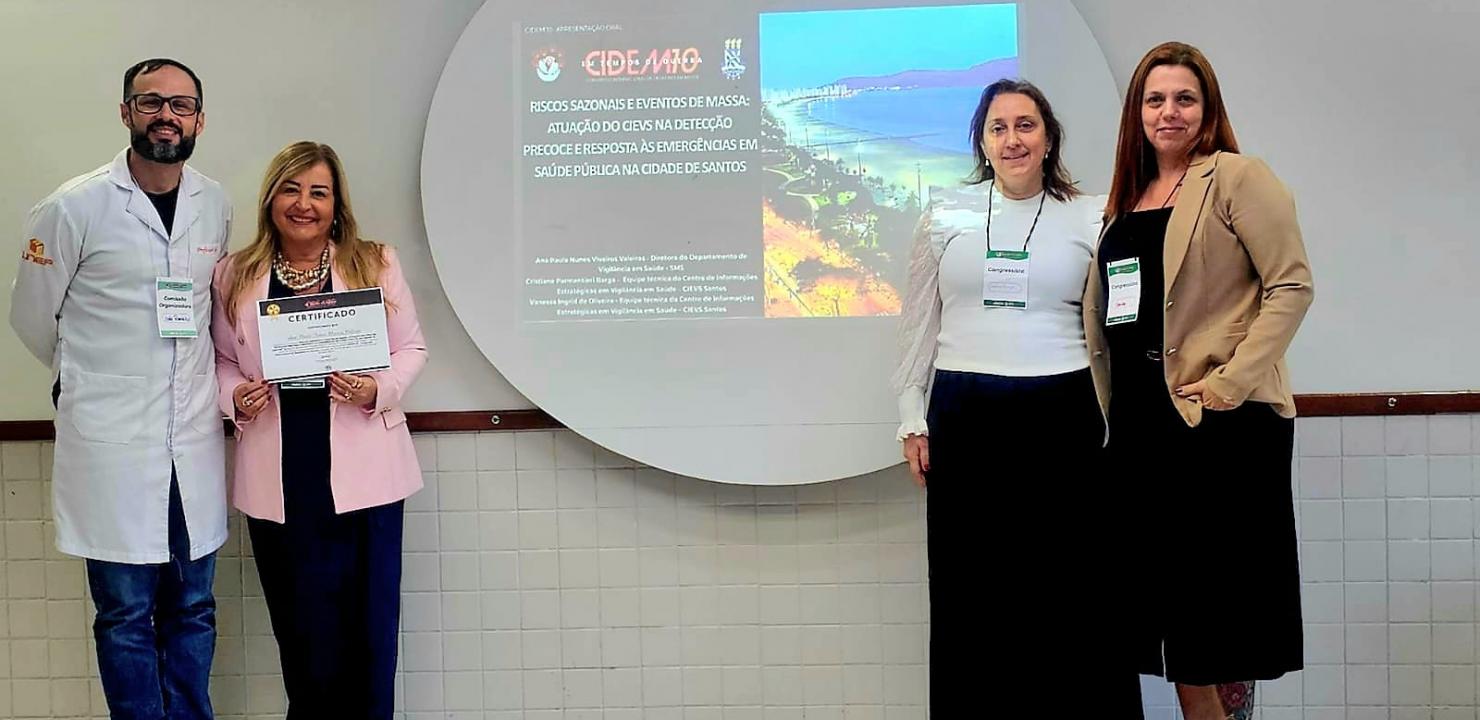 “Em Santos, o Cievs possui uma equipe própria, com dedicação exclusiva. O trabalho acontece ao longo de todo ano, sempre se preparando para os eventos futuros, sem se desligar dos acontecimentos em saúde pública no Brasil e no mundo que podem repercutir no município”, explica Ana Paula Valeiras, diretora de Vigilância em Saúde, acompanhada no congresso pelas servidoras Cristiane Parmentieri Barga e Vanessa Ingrid de Oliveira.