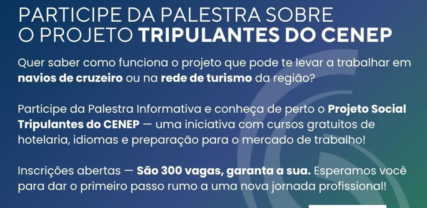 Santos firmou parceria com o projeto ‘Tripulantes do Cenep’ a fim de qualificar jovens da Cidade para o setor de turismo e cruzeiros. A iniciativa, que visa ampliar as oportunidades de emprego e fomentar o desenvolvimento profissional, oferece cursos gratuitos de hotelaria, idiomas e orientação para o mercado de trabalho, com foco no setor turístico e nas oportunidades em navios de cruzeiro.