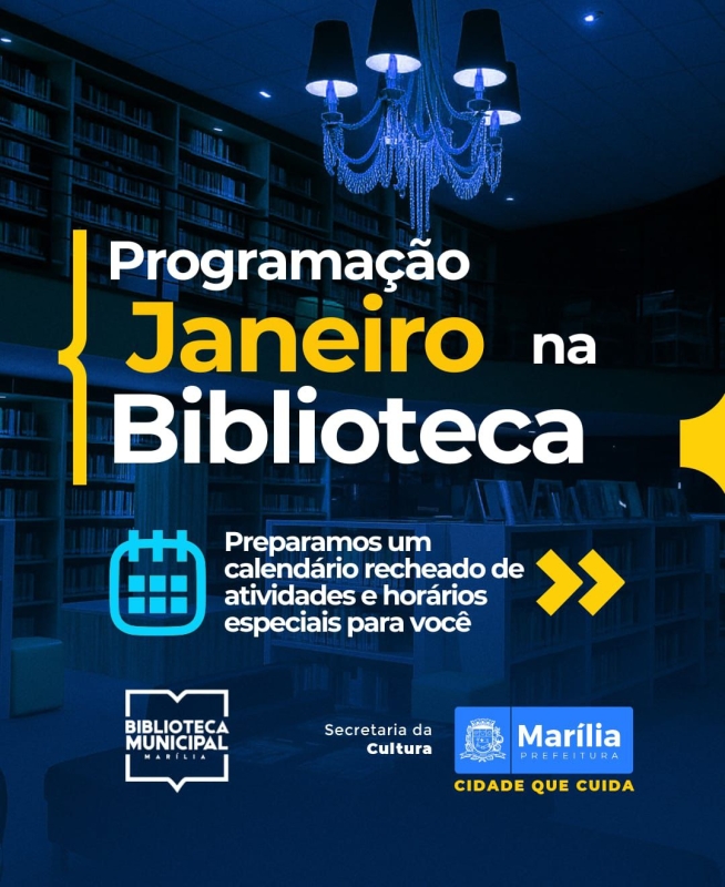 A Prefeitura de Marília, por meio da Secretaria da Cultura, divulga a programação cultural do mês de janeiro, com uma agenda diversificada de atividades gratuitas voltadas a crianças, jovens e adultos. As ações acontecem na Biblioteca Municipal e contemplam exposições, oficinas, contações de histórias, eventos literários, clubes de leitura e programas permanentes.