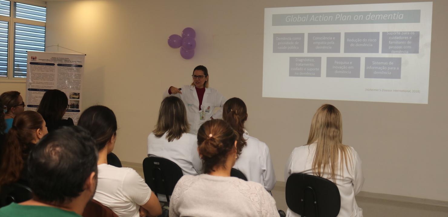 Na última quinta-feira (25), foi realizado o 1º Encontro de Setembro Lilás, no auditório da unidade. O evento busca capacitar os profissionais que atuam nas policlínicas para o atendimento eficiente e humanizado aos pacientes diagnosticados com Alzheimer e outras demências. Enfermeiros, fisioterapeutas, médicos, psicológicos e estagiários de diversas áreas da saúde foram instruídos pela equipe especializada da unidade.