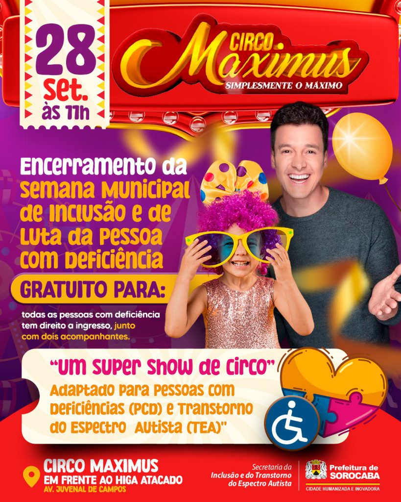 Após uma série de ações realizadas durante a Semana de Inclusão e Luta da Pessoa com Deficiência (Semana PCD), a Prefeitura de Sorocaba, por meio da Secretaria de Inclusão e do Transtorno do Espectro Autista (Sintea) e em parceria com o Circo Maximus, vai proporcionar, neste domingo (28), às 11h, uma sessão especial e gratuita para pessoas com deficiência (PCD) e Transtorno do Espectro Autista (TEA).