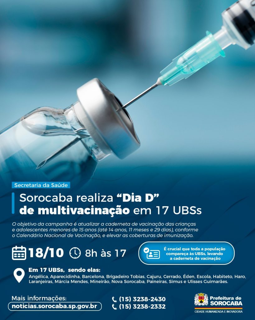 A Prefeitura de Sorocaba, por meio da Secretaria da Saúde (SES), realizará, neste sábado (18), o “Dia D” de Multivacinação, com todas os imunizantes disponíveis no calendário de vacinação.