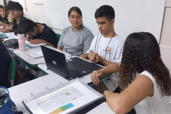 Estudante com deficiência visual recebe explicação de professora, enquanto profissional de apoio acompanha ao lado dele