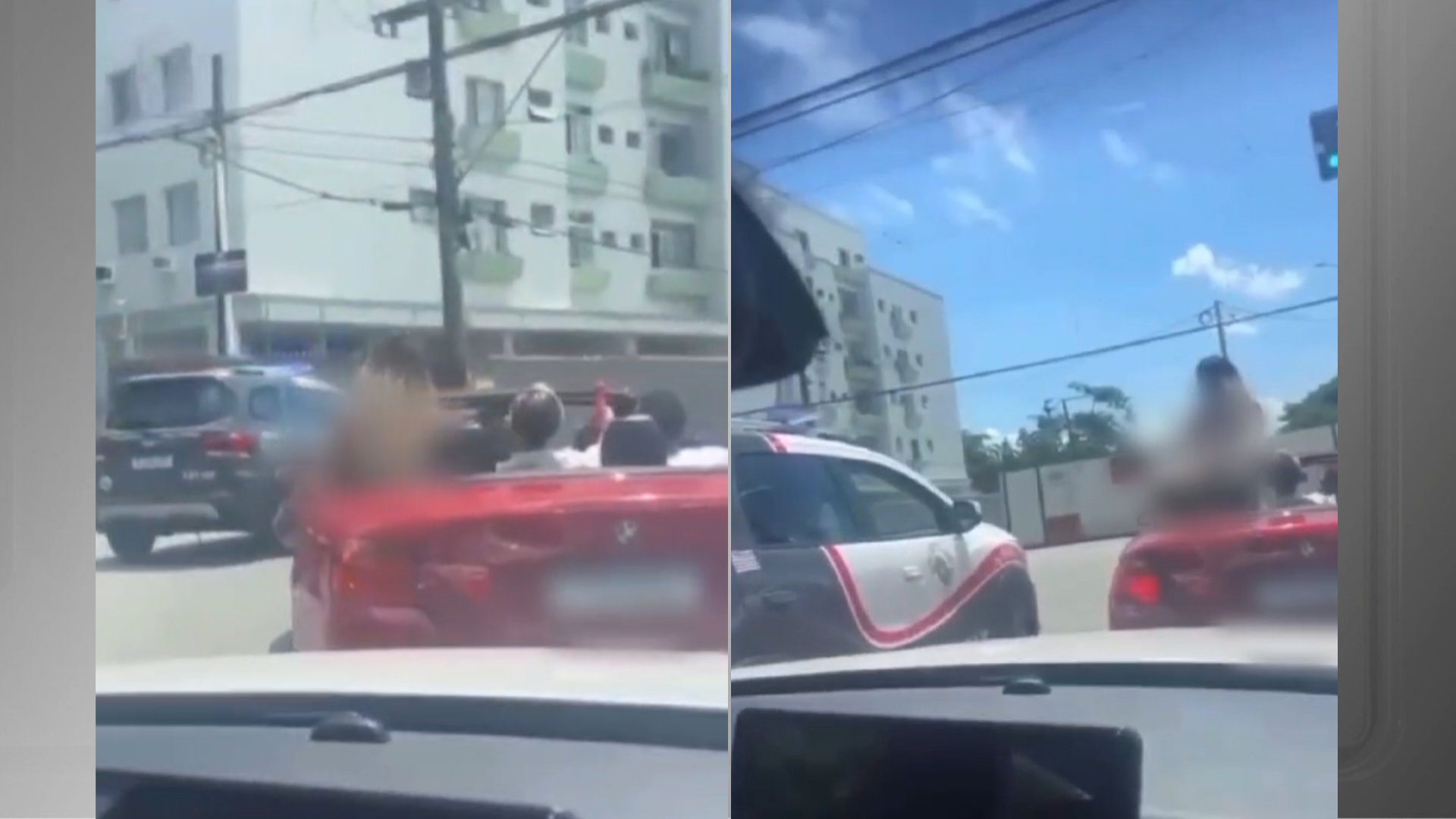 A situação foi gravada por um carro que seguia atrás do conversível e da viatura.
