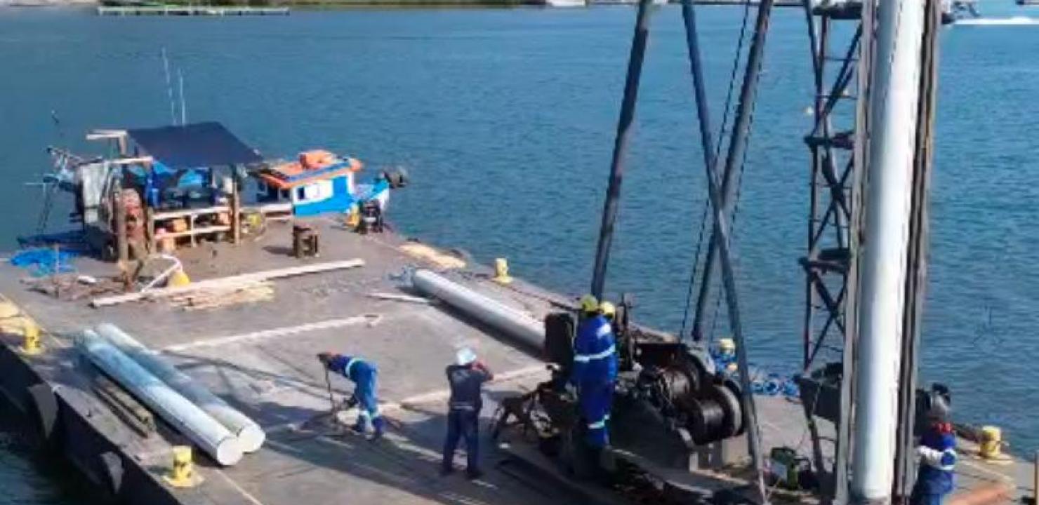Terminou nesta terça-feira (9) o estaqueamento para a construção de dois píeres e de uma fonte interativa, que integram a primeira etapa do projeto da Prefeitura de reurbanização do Portinho Caruara. Foram fincadas, a uma profundidade de 35 metros, 53 estacas de 38 centímetros de diâmetro. Trinta e cinco estacas foram cravadas no braço maior do Canal de Bertioga e outras oito no braço menor, enquanto a área da fonte interativa recebeu 10 unidades.