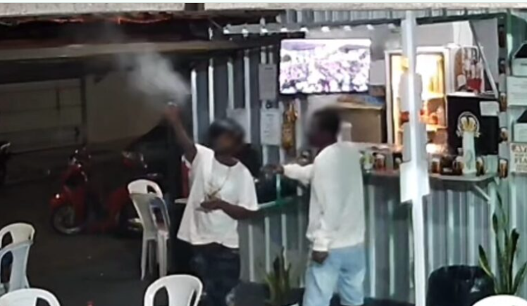 O vídeo, obtido pela polícia, mostra o homem acompanhado de outro sujeito com uma lata de bebida na mão. Ele tira satisfações, aponta o revólver e dispara várias vezes. O áudio revela correria e gritos no local.