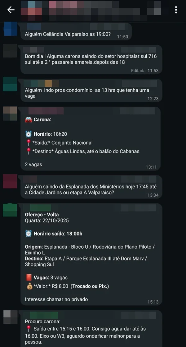 A reportagem conversou com alguns integrantes do grupo, que pediram para serem identificados por nomes fictícios. Moradora de Cidade Ocidental (GO), Ana, 33 anos, disse que passou a utilizar os grupos de caronas há quatro meses.