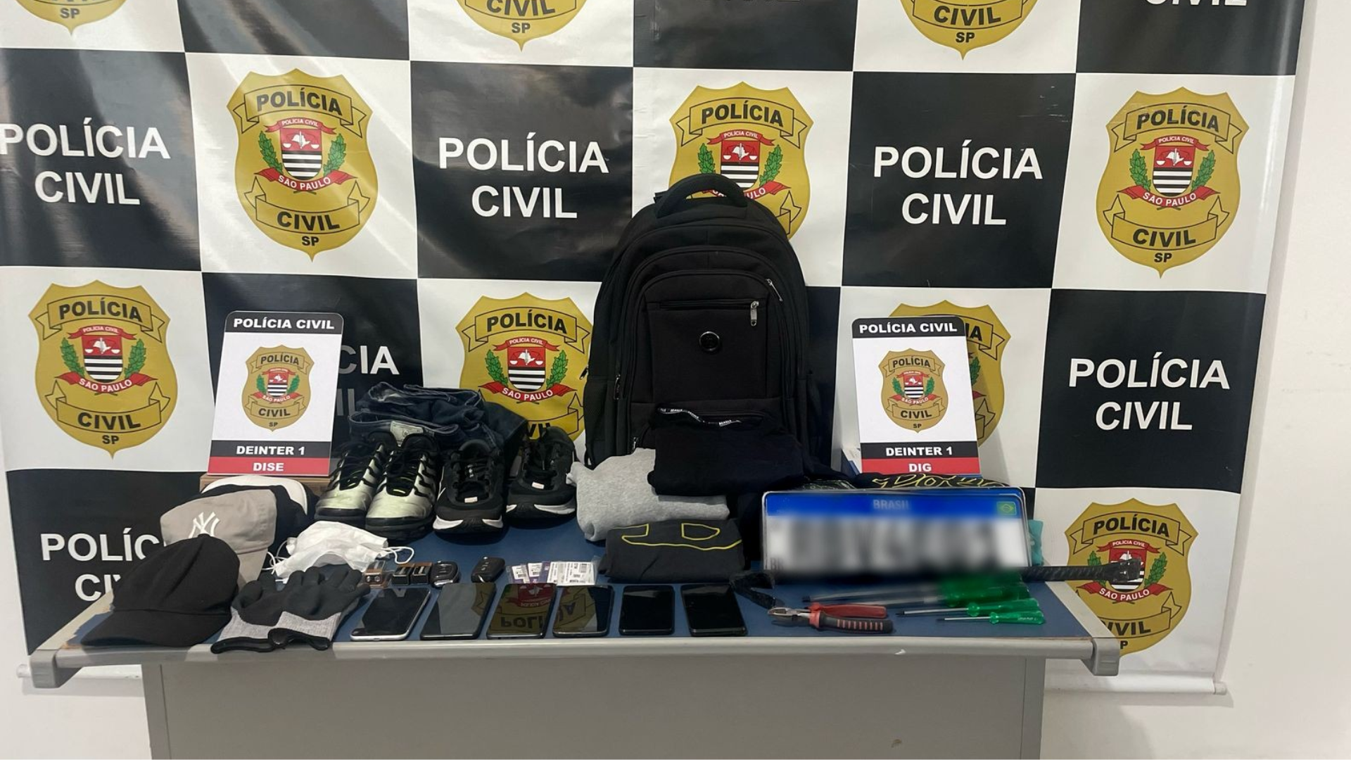 Além dos materiais utilizados para cometer os crimes, as equipes ainda apreenderam malas, celulares, roupas e sapatos dentro do carro.