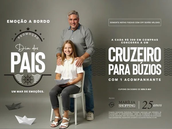 O mês dos pais se despede em grande estilo no Marília Shopping, com uma campanha que une emoção, presentes especiais e a chance de viver uma experiência única em alto-mar. Até 31 de agosto, quem realizar compras no valor de R$ 300,00 nas lojas participantes ainda pode garantir números da sorte para concorrer a um cruzeiro da CVC a bordo do luxuoso MSC Preziosa, com saída de Santos e escala em Búzios.