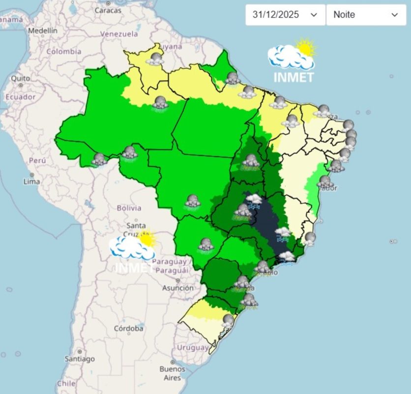 A chegada de 2026 deve ser marcada por pancadas de chuva em praticamente todas as capitais do país, sobretudo nas regiões Sul, Sudeste e Centro-Oeste, segundo previsão do Instituto Nacional de Meteorologia (Inmet) para esta quarta-feira (31/12). A atuação de frentes frias no Centro-Sul eleva a umidade e favorece a formação de nuvens carregadas, cenário típico do verão, com precipitações irregulares alternando com períodos de calor.