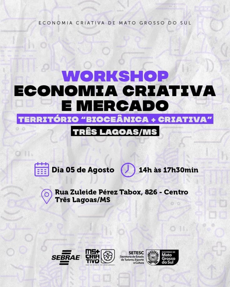 A Prefeitura de Três Lagoas, por meio da Diretoria de Cultura da Secretaria Municipal de Educação e Cultura (SEMEC), abriu inscrições para o Workshop de Economia Criativa e Mercado – Território “Bioceânica + Criativa”. O evento, que ocorrerá no dia 5 de agosto, mudou de endereço e agora será realizado na Rua Zuleide Pérez Tabox, 826, no centro, das 14h às 17h30. Essa iniciativa é promovida pela Superintendência de Economia Criativa de Mato Grosso do Sul, vinculada à Secretaria de Estado de Turismo, Esporte e Cultura (SETESC), e faz parte do programa MS+Criativo, com o apoio da Prefeitura de Três Lagoas.