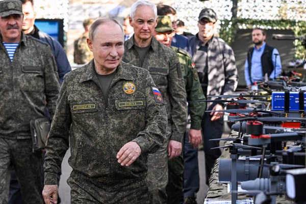 Com uniforme militar, o presidente Vladimir Putin inspecionou pessoalmente tropas e armamentos em Nizhny Novgorod, onde classificou a atividade como um “exercício que prioriza a soberania russa”.